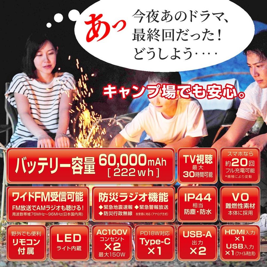 ポータブル電源にテレビとラジオが搭載、60,000mAh の大容量バッテリーで 重量は5.8kg と運びやすいです。